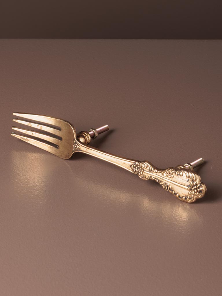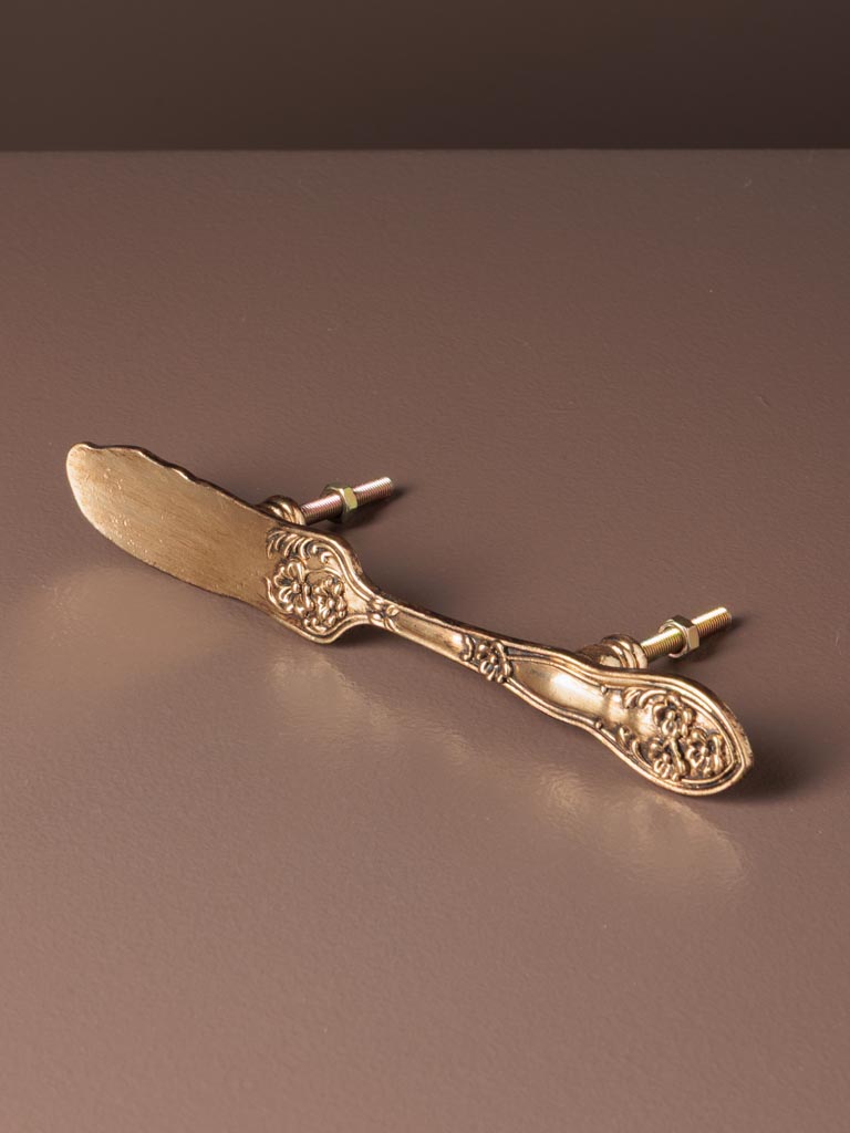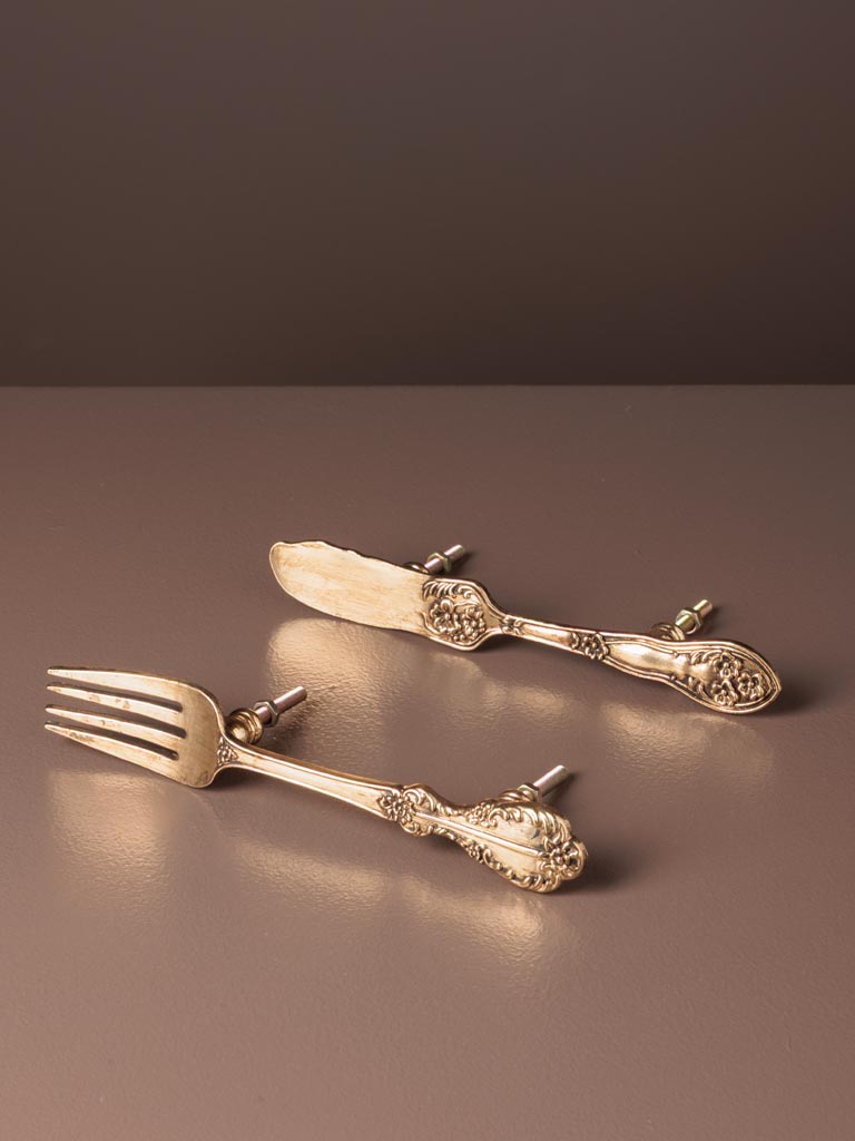 Original conjunto de 2 pomos metálicos con forma de cubiertos antiguos (cuchillo y tenedor).