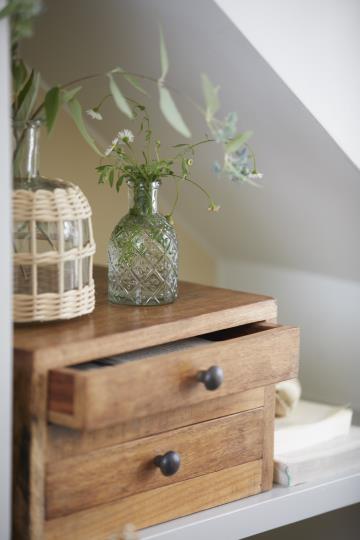 Botella de cristal inspirada en los frascos de farmacia antiguos. Decorativa y elegante, esta mini botella (h. 11 cm) combina el encanto del diseño vintage con la sutileza de un grabado tipo harlequín, que refleja la luz de manera cálida y delicada.