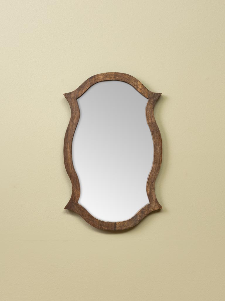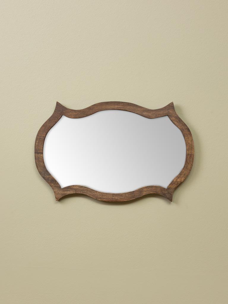 Espejo “Horus” con marco de madera: espejo de pequeño tamaño con marco de madera de mango oscuro. La belleza del marco es la forma del marco con ondas que hace de este espejo un elemento decorativo que puedes colgar en una pared haciendo una composición con marcos y cuadros. Perfecto en un recibidor o en un dormitorio.