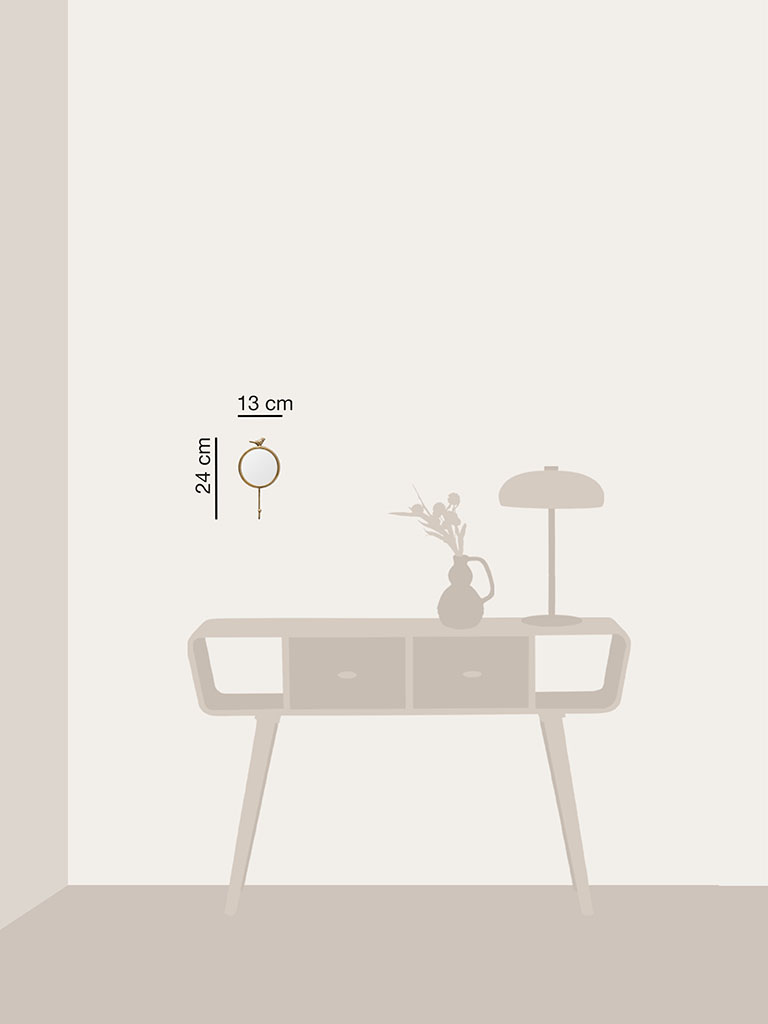 Delicada percha de metal dorado con gancho, decorada con un pequeño espejo redondo coronado por un pajarito.