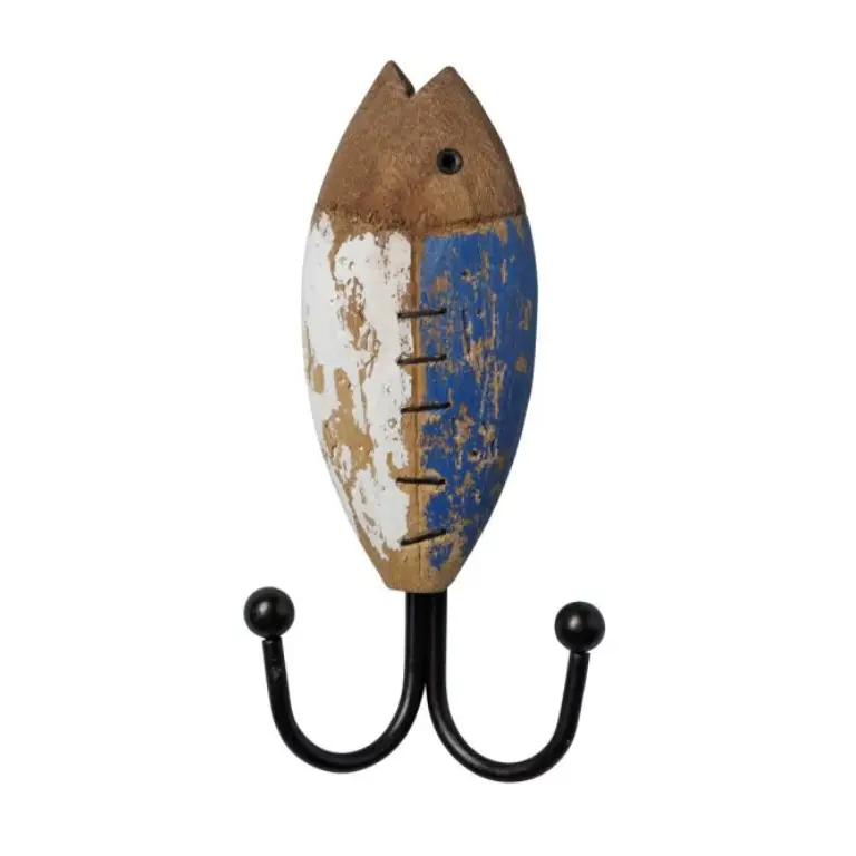 Percha de madera con forma de pez azul y blanco: el aspecto y acabado del pez de madera recuerda las maderas gastadas por el agua de mar y el sol….y el resultado es una pieza con muchísimo encanto que parece recuperada de una vieja casa en la orilla del mar. La perche tiene dos ganchos de metal negro: funcional y bonita.