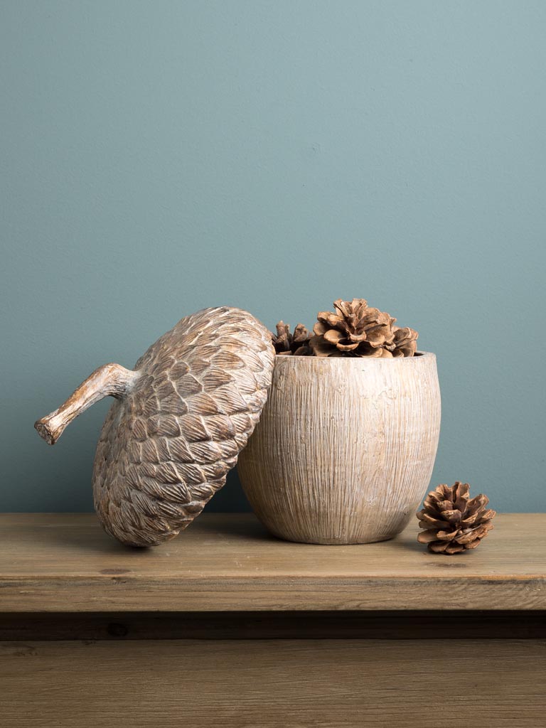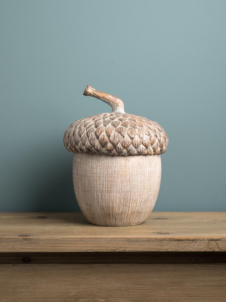 Original caja decorativa en forma de bellota, realizada en resina con acabado natural que imita a la perfección la textura de la madera.