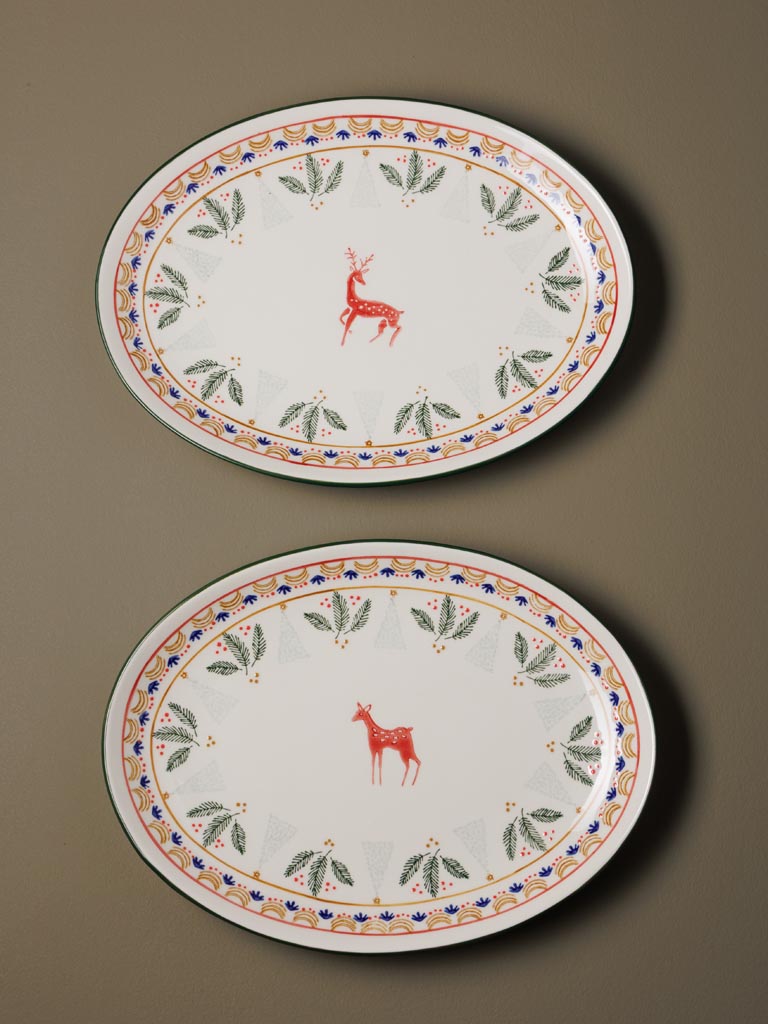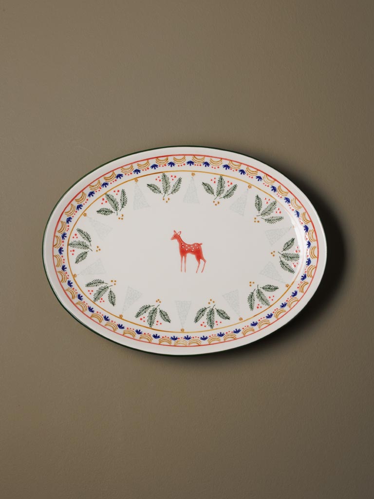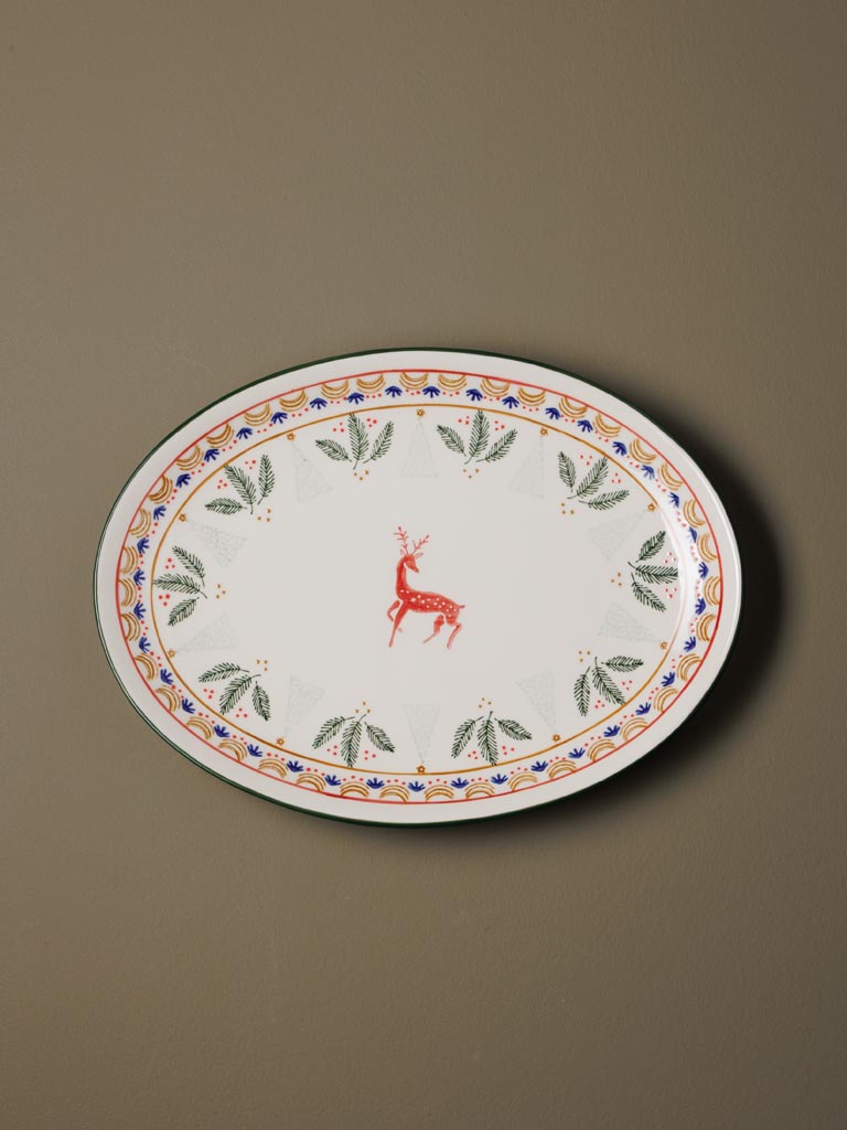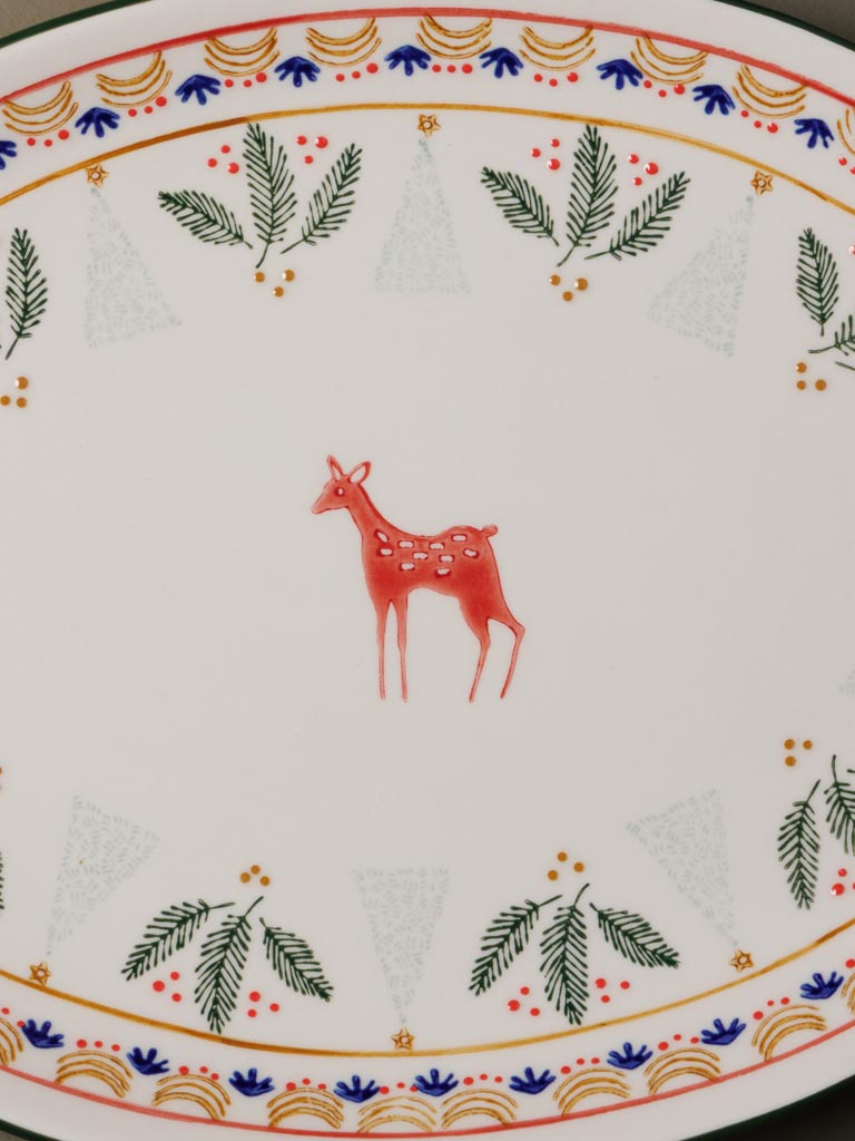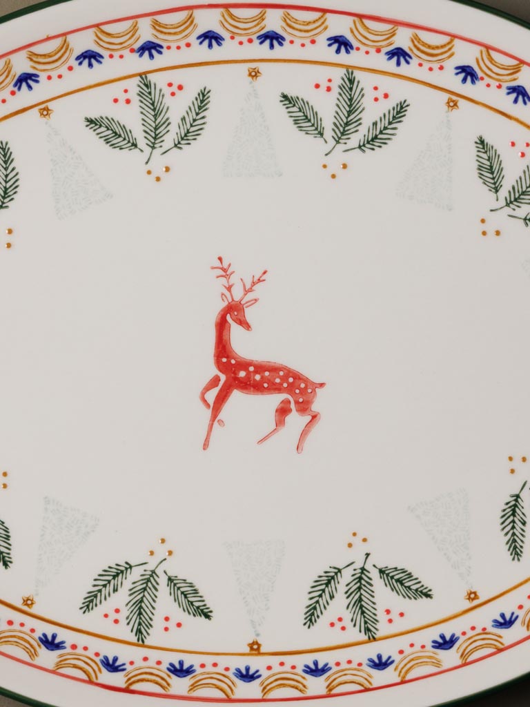 Fuente ovalada de gres cerámico decorada con un delicado ciervo rojo en el centro y un elegante borde de ramas de abeto, piñas y motivos en tonos amarillos, verdes y azules.