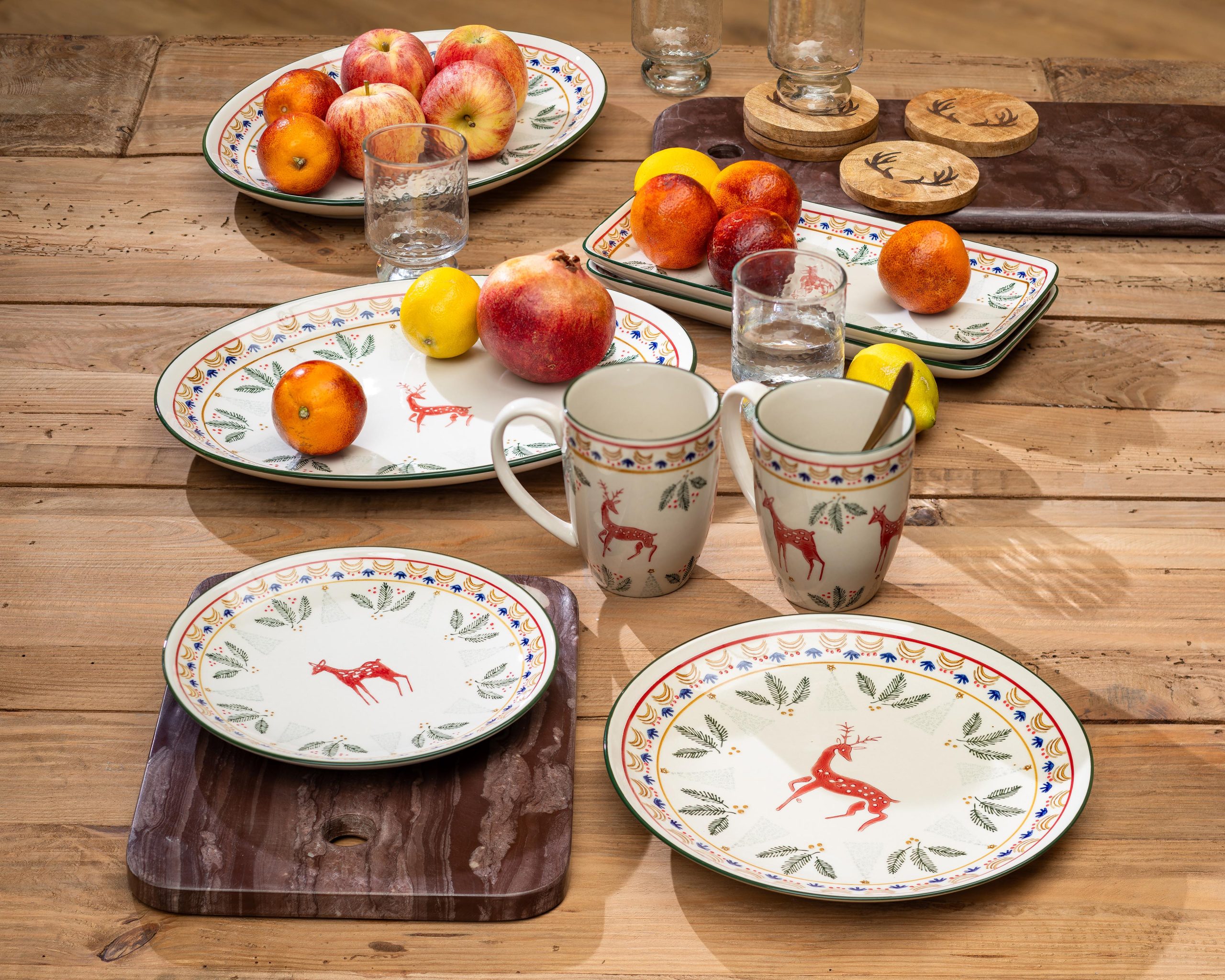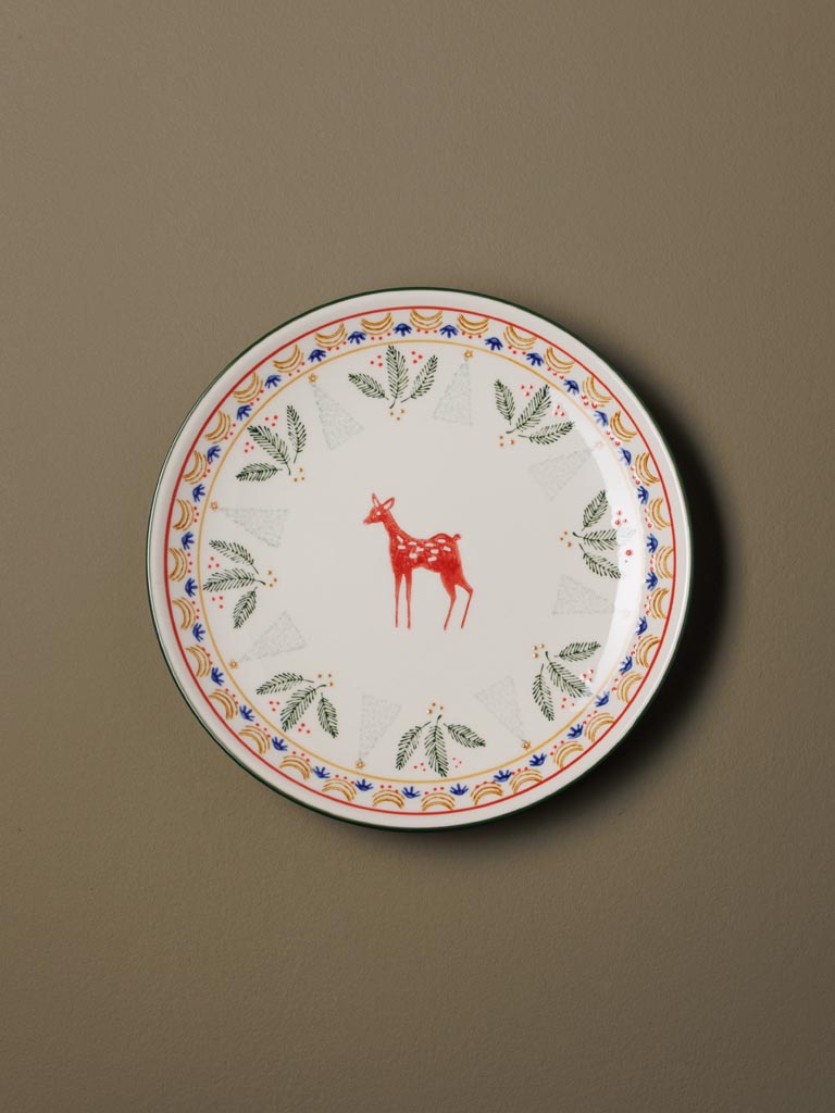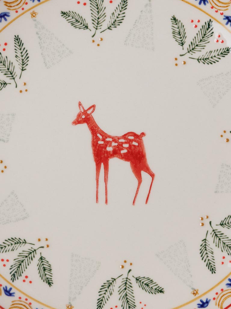 Plato de gres cerámico decorado con un delicado ciervo rojo en el centro y un borde con ramas de abeto y motivos geométricos en tonos verdes, amarillos y azules.