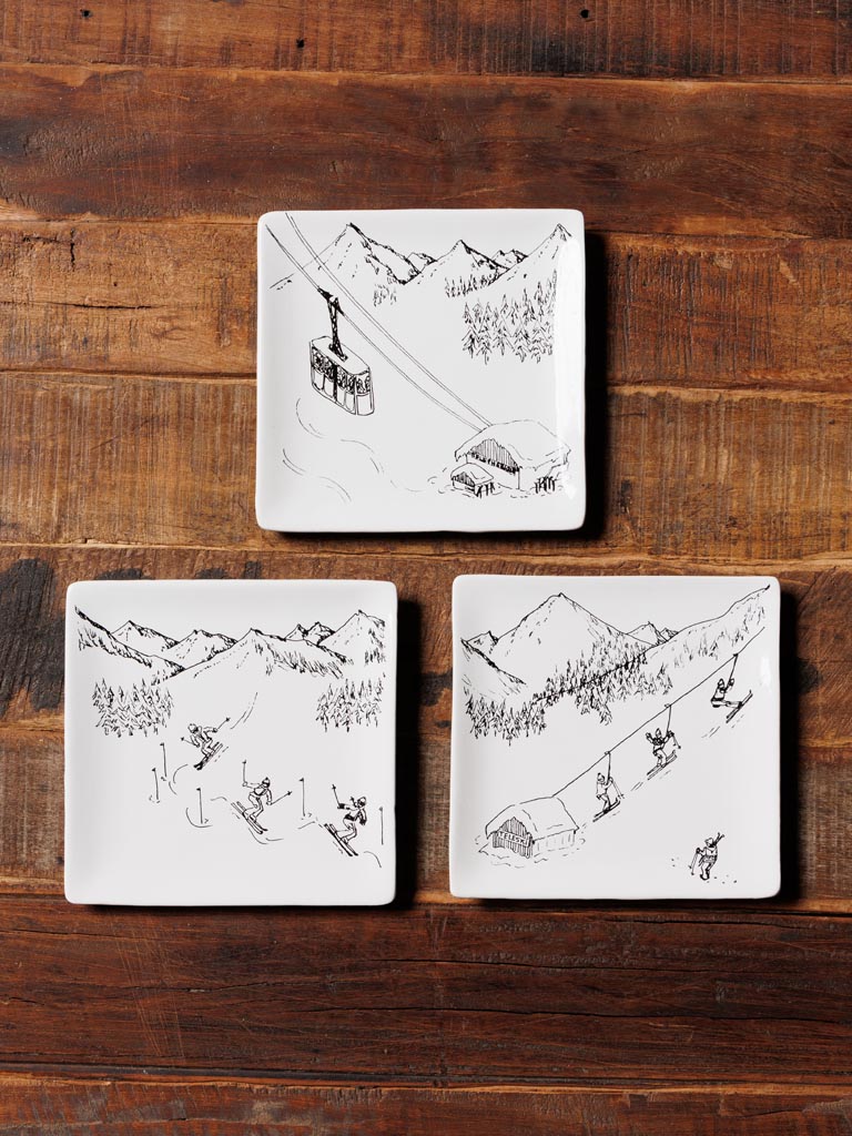 Set de tres platos cuadrados de cerámica esmaltada decorados con ilustraciones en blanco y negro inspiradas en el mundo del esquí.