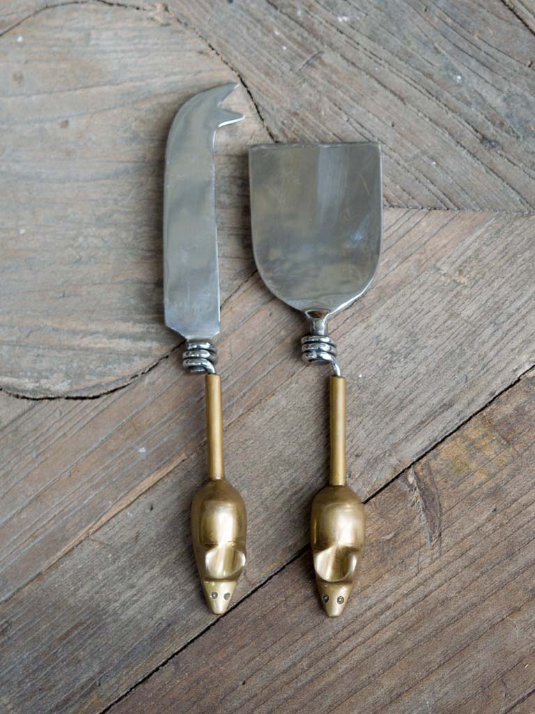 Set de dos utensilios para queso con mangos de latón en forma de simpáticos ratoncitos.