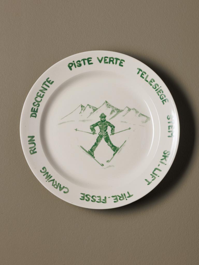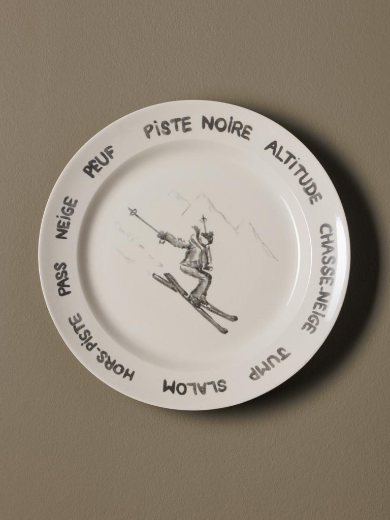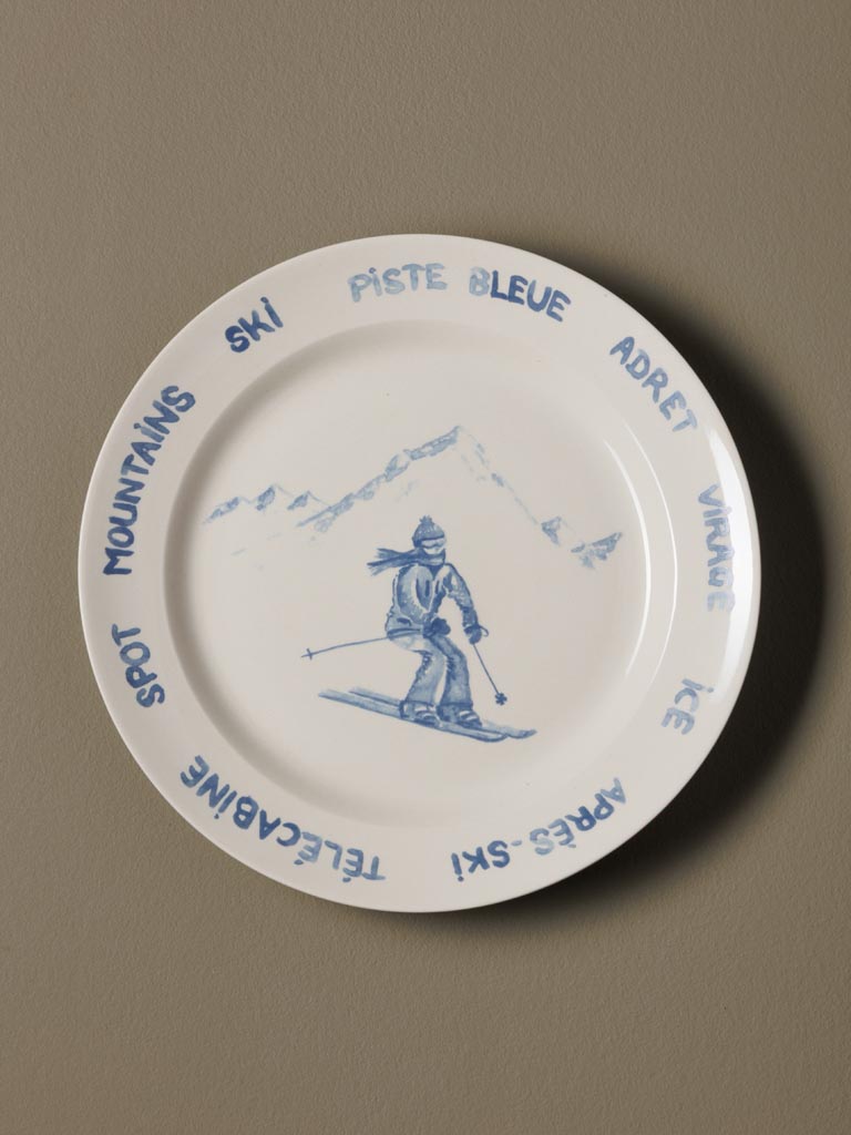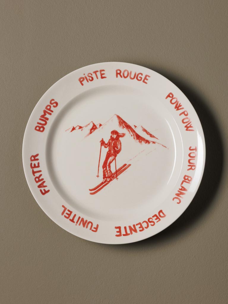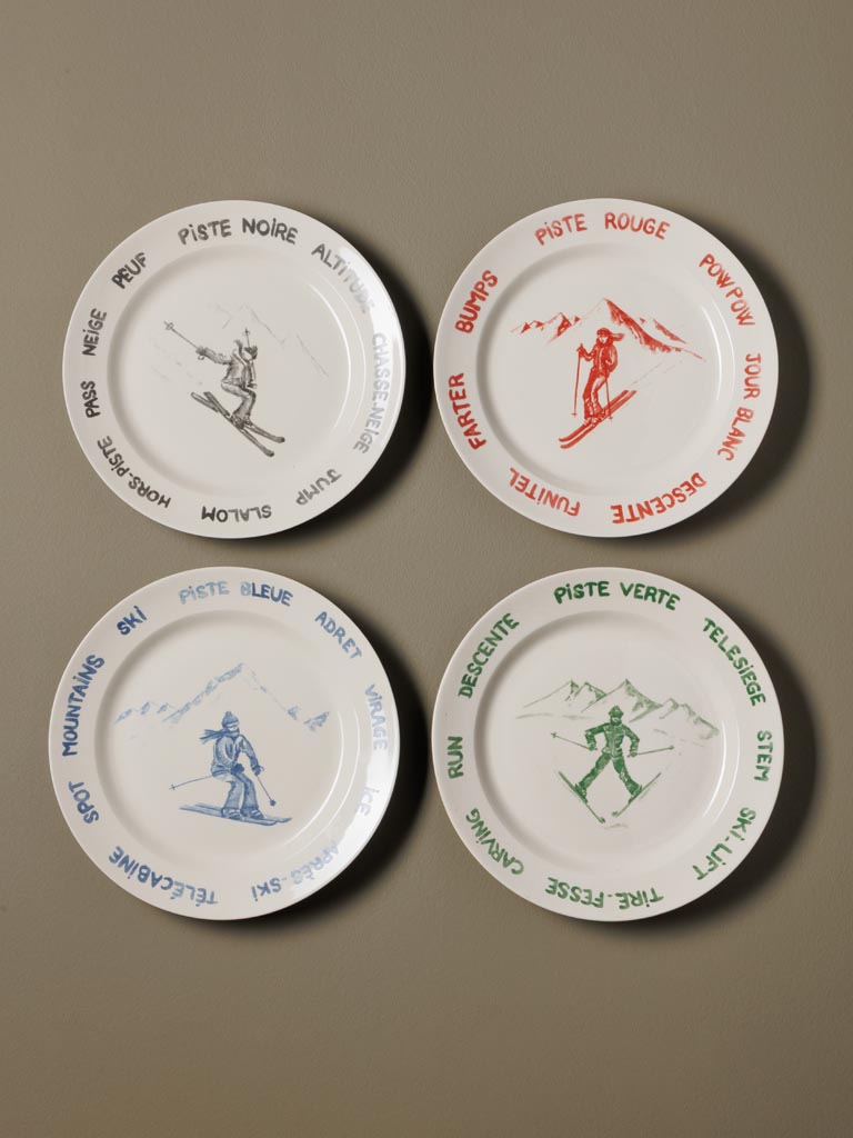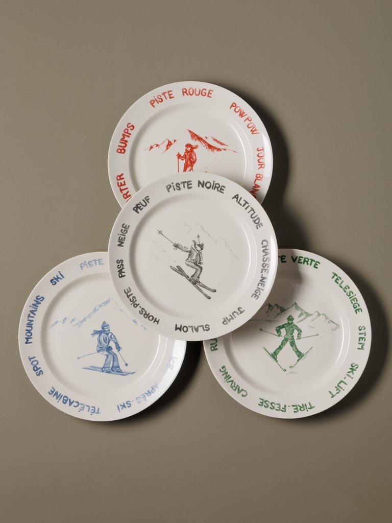 Set de 4 platos de gres cerámico decorados con divertidos esquiadores y textos de inspiración alpina en cuatro colores distintos: rojo, verde, azul y gris.