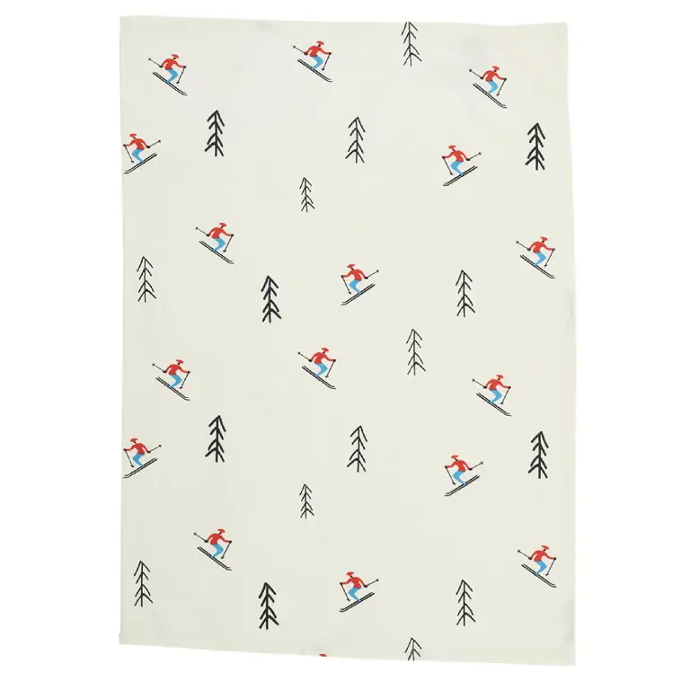 Este set de paños de cocina combina la practicidad del algodón 100% con un diseño lleno de encanto. Sobre un fondo beige, destacan esquíes de colores en una esquina, abetos estilizados repartidos por todo el paño y esquiadores en movimiento que evocan la vida en la montaña. Perfectos para crear un ambiente acogedor y sofisticado en tu chalet o cocina rústica. Además de su uso como paños, son ideales como manteles pequeños o tapetes decorativos para dar un aire alpino a tu mesa.