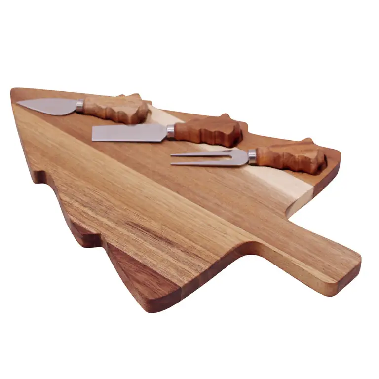 Tabla redonda de madera de acacia con aro en el mango, práctica y decorativa para cortar o servir alimentos.