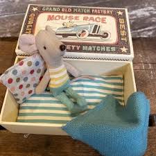 Este ratoncito, que duerme en su cajita de fósforos es adorable. Muy elegante está listo para salir: lleva pantalones y una camiseta de rayas amarillas …pero a la vuelta se irá a dormir en su preciosa cajita preparada con una manta azul verdoso  y un almohada de lunares multicolores ¡Es preciosa!