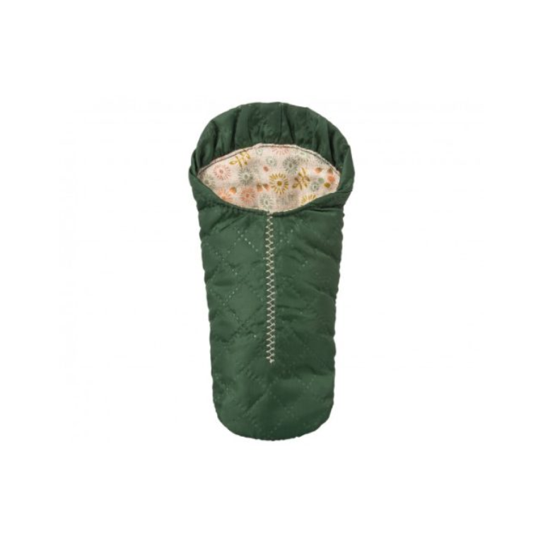 El saco de dormir de Maileg está hecho a medida de ratones para que puedan disfrutar calentitos sus excursiones en el campo: es de tela verde oscura hidro repelente con costuras y está forrado con una tela de flores. Se dobla y cabe dentro de un saco verde que el ratón puede llevar al hombro.