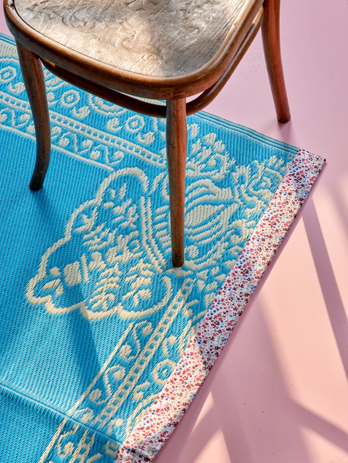 Da un aire fresco y encantador a tu hogar con esta preciosa alfombra azul adornada con un delicado estampado blanco y bordes florales. Su diseño aporta un toque elegante y acogedor a cualquier espacio, convirtiéndola en la pieza perfecta para darle vida a tu salón, dormitorio o rincón favorito.