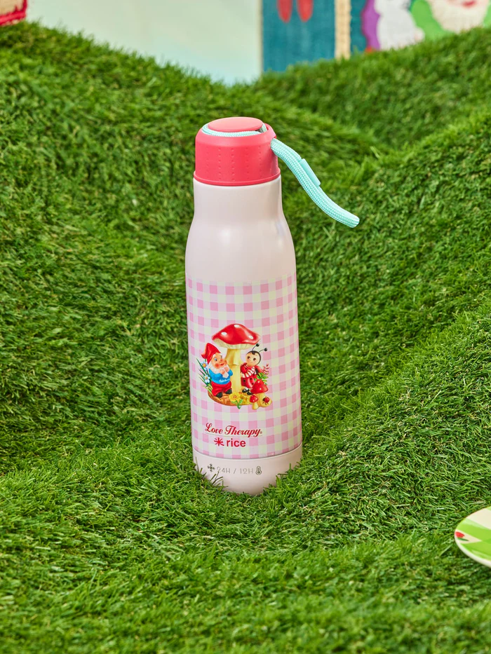 Sumérgete en un mundo mágico y alegre con esta encantadora botella de acero inoxidable en rosa, decorada con un adorable estampado de gnomos.