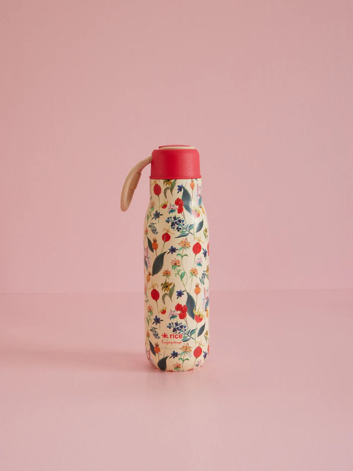Una botella práctica y encantadora que no solo hidrata, también decora tu día. Con el delicado estampado Winter Rosebuds, esta botella de acero inoxidable mantiene tus bebidas frías hasta 24 horas y calientes hasta 12. Ideal para llevar en el bolso, al trabajo o en tus escapadas, gracias a su tapa con cuerda para transportarla cómodamente.
