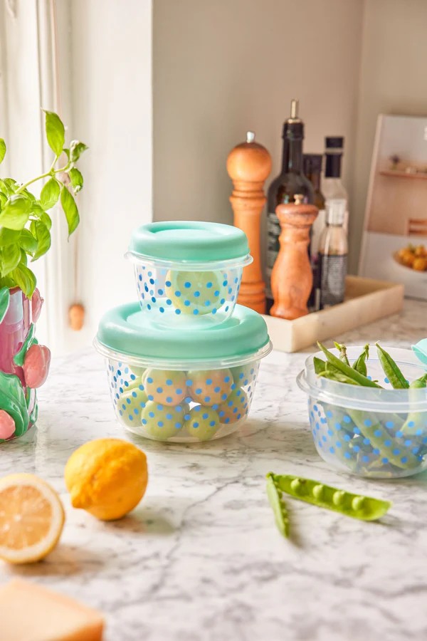 Prácticos, bonitos y muy versátiles. Este set incluye 3 recipientes redondos en distintos tamaños, ideales para frutos secos, aliños, bocadillos o sobras de comida. Sus tapas en color menta con topos azules añaden un toque alegre y encantador a tu cocina.