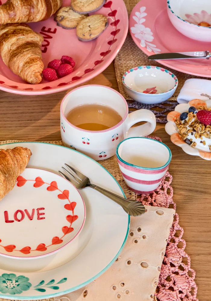 Endulza tus momentos de café con esta encantadora taza de capuchino en color crema decorada con delicadas cerezas rojas pintadas a mano. Cada pieza es única y refleja el cuidado artesanal de talentosas mujeres portuguesas, lo que convierte cada sorbo en un detalle especial.